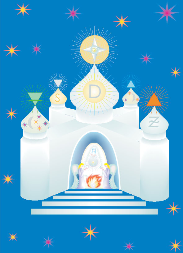 Символом Небесного Града Новой России на Земле является пятикупольный Храм Знаний Отца Далноса, состоящий из четырёх башен с куполами и большой, возвышающейся в середине, пятой башни с серебристо-белым куполом (рис.1).