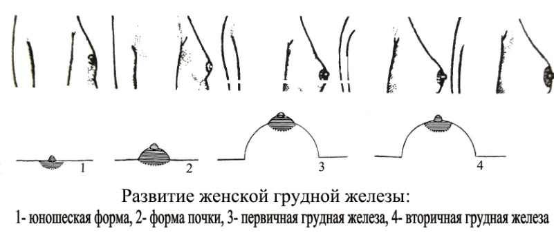 Развитие молочных желез начинается у плода в возрасте 5 месяцев, а при рождении уже имеются соски с примитивными молочными ходами. Иногда непосредственно перед родами в организме матери происходит сильный выброс гормонов, которые воздействуют и на плод, и младенец рождается со слегка увеличенными молочными железами. В первые несколько дней они у младенца могут даже набухать и выделять молозиво, но это быстро проходит. Обычно половое созревание у девочек начинается в 7 9 лет, в этот переод еще нет каких либо изменений с грудью. Гормональная перестройка организма девочки начинается с пубертатного периода. Во второй половине подросткового периода, с установлением менструального цикла, фигура девочки начинает приобретать женские очертания, и первым признаком полового созревания является развитее молочных желез. Поэтому как правило молочные железы начинают развиваться в возрасти 10 14 лет. Рост груди начинается с роста соска и околососкового кружка (ареолы). Первый этап развития грудной железы характеризуется почти полным отсутствием, а потом околососковый кружок еще не выступает на поверхности груди. Над таким плоским околососковым кружком приподнимается только малоразвитый сосок. Во втором периоде («этап почки») не только сосок, но вместе с ним и околососковый кружок приподнимается в виде полушаровидного бугорка на поверхности груди. Третий этап в развитии грудной железы, характеризующий половую зрелость женщины, сопровождается сильным развитием железистого тела и жировой капсулы. Над уровнем груди приподнимаются не только сосок с околососковым кружком, но и окружающие их мягкие части (первичная грудная железа). Цвет соска может варьировать от светло розового до темно коричневого. В этот переод молочные железы могут развиваться не симметрично, в этом нет ничего страшного, так как грудь еще может измениться в течении 4 5 лет, пока идет перестройка. В среднем грудь, заканчивает расти в 17 18 лет, но у всех это индивидуальный процесс. Ведь грудь может начать расти как в 9, так и в 15 лет, на их конечную форму это не влияет. Молочная железа достигает постепенно своего полного развития под влиянием созревания женской половой железы (яичников), в связи с чем обнаруживает резкие возрастные изменения в строении, размерах и форме. Основой грудной железы является железистое тело, состоящее из 15 20 конусовидных долей, расположенных вокруг грудного соска. Каждая доля представляет собой сложную железу, вырабатывающую молоко; выводные протоки этих желез в количестве двенадцати пятнадцати открываются на соске. Железистое тело окружено слоем жира, образующим жировую капсулу железы. От количества жира зависит в основном размер грудной железы. Однако развитие грудной железы на этом не останавливается. У ро