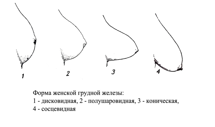 По форме можно различать четыре вида грудных желез: дисковидную, полушаровидную, коническую и сосцевидную.