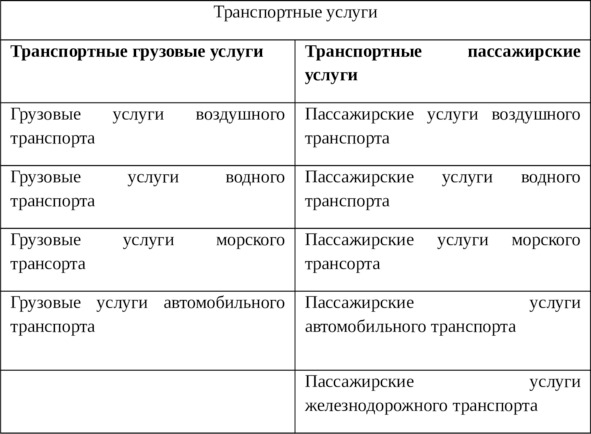 Таблица 1.1.1 «Классификация транспортных услуг»