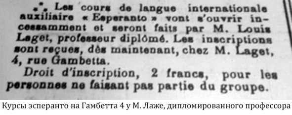 Эсперанто был изобретен офтальмологом Лазарем Заменгофом в 1873 году для общения между враждующими нациями того времени. Помимо преподавания в Арле, Лаже путешествовал за границу, чтобы продвигать этот дипломатический язык и помочь принести понимание и мир в Европу. В итоге его усилия оказались тщетными. Взаимные подозрения росли, и когда эсперанто стал восприниматься как угроза французскому языку, его преподавание было запрещено. Альянс Франсез, который продвигал национальный язык, оказался гораздо более успешным.