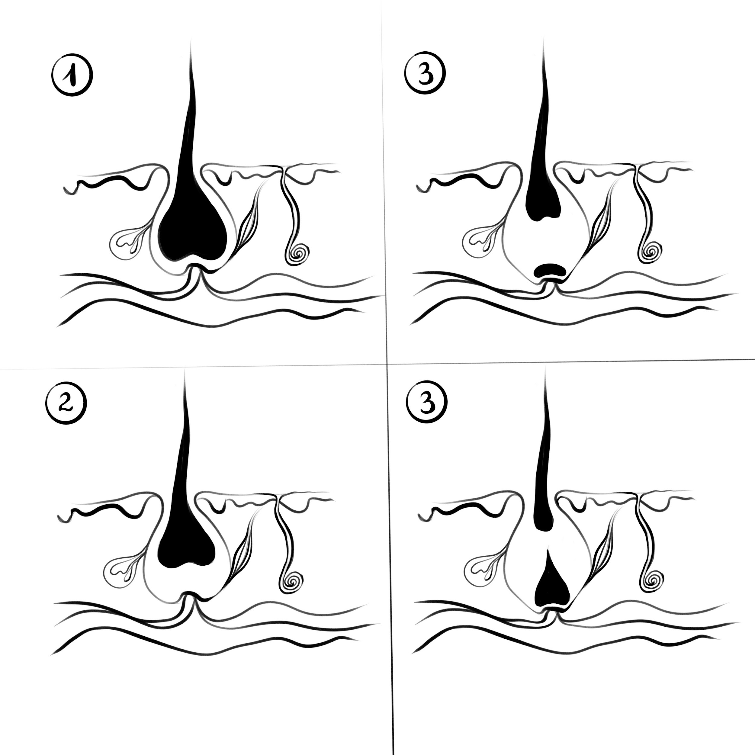 Каждый фолликул имеет мышцу, которая под воздействием страха или холода, поднимает волос. Наверняка многие помнят выражение "волосы дыбом", представьте себе, этот феномен имеет место быть. Только на голове их движение почти не заметны для нашего глаза. Но подобное явление мы можем наблюдать воочию у наших домашних животных. Когда они возбуждены или им страшно, волос становится почти перпендикулярно поверхности.
