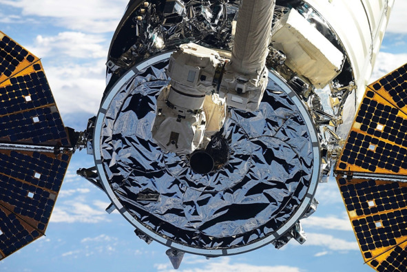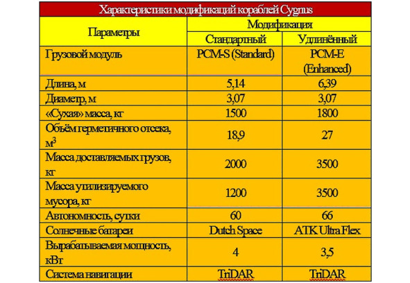 также несет такелажный узел для захвата корабля манипулятором станции. Модуль SM оснащен выдвижными панелями солнечных батарей (СБ), аккумуляторами и радиоэлектронным оборудованием. Стандартный вариант оснащался двумя трехсекционными «крыльями» СБ от компании Dutch Space; усовершенствованный Cygnus имеет сверхгибкие круглые панели с фотоэлементами на арсениде галлия, построенные Alliant Techsystems (АТК) новым партнером Orbital. Последние вырабатывают до 3500 Вт несколько меньше стандартных, но при массе всего в 25% от них. Кроме того, в транспортном положении они более компактны. Мощность, потребляемая РСМ, не превышает 850 Вт. SM также содержит основную двигательную установку и систему управления ориентацией. Для выполнения маневров коррекции орбиты Cygnus оснащен двигателем ВТ-4, разработанным японской компанией IHI Aerospace. Он имеет «сухую» массу 4 кг, длину 0.65 м и развивает тягу 100 фунтов (45.4 кгс), используя смесь окислов азота MON-3 и гидразин. Компоненты топлива (828 кг) хранятся в сферических резервуарах и вытесняются в двигатель сжатым гелием. Система управления, оснащенная 32 микродвигателями тягой по 7 фунтов (3.2 кгс), служит для переориентации и малых маневров при сближении. В модуле SM также находятся блоки системы наведения, навигации и управления, оборудование для связи корабля с наземными станциями, МКС и спутниками системы слежения и передачи данных TDRS (Tracking and Data Relay Satellite). Cygnus оснащен звездным датчиком и системой определения абсолютного положения в пространстве по навигационным сигналам GPS во время свободного полета по орбите. Во время встречи и стыковки