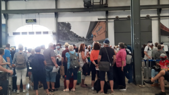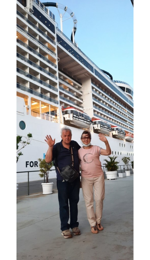 Ну посидели на стульчиках, подождали, повторно прошли ПЦР, несмотря на то, что мы только вчера его прошли, заплатив 80 долларов. Правда здесь уже не платили. Я спросил, что наш ПЦР не действителен? Нет, действителен, но Ваш ПЦР на 48 часов, а надо на 72. В правилах безоасности про это ни слова не было. Совершено странное объяснение, ведь с момента сдачи нами теста в сертифицированном медицинском центре не прошло и 24 часов. А здесь тест делал MSC. Экспресс тест, в выделенном в ангаре закуточке, не отличавшемся стерильностью и у всех на виду. Создалось впечатление, что это такой отмыв денег. Надо списать тесты и показать, что компания беспокоится о туристах и является компанией номер 1 по борьбе с тестами. Наконец мы сдали паспорта. И тут на нас кончились какие-то бирочки, которые до ранее все наклеивали на грудь. С нами всегда так. «То жилет дырявый, то свисток без дырки». Пошли без бирочек. Но паспорта вернули. Прошли мы с Аминой Равильевной регистрацию. Вышли на волю, сфотографировались возле корабля. Радостно постукивая колесиками чемоданчика, пошли на посадку.