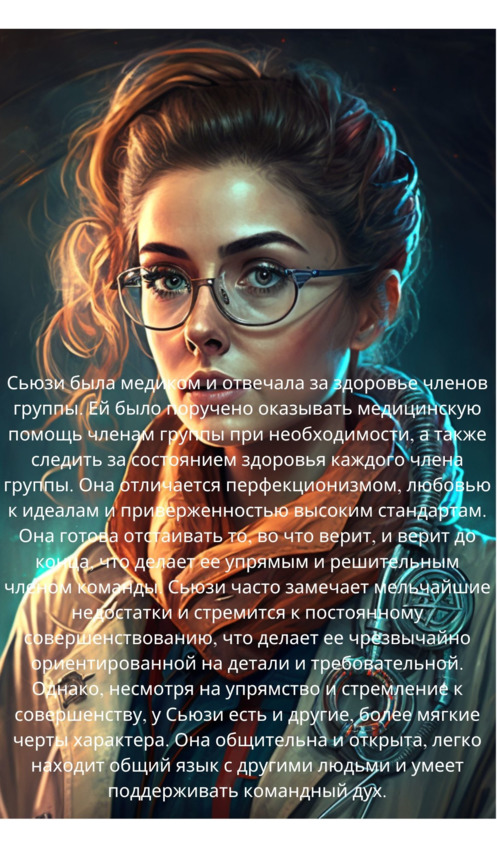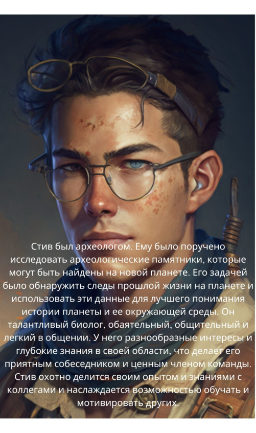 Лиза была инженером по робототехнике. Она отвечала за обслуживание и настройку роботов, которые использовались в экспедиции для выполнения различных задач, от исследования окружающей среды до строительства инфраструктуры. Она уверенная, целеустремленная и умная женщина, всегда готовая взяться за технические задачи и решить их быстро и эффективно. Лиза обладает критическим мышлением и аналитическими способностями, что позволяет ей быстро адаптироваться к новым ситуациям и оценивать возможные риски.