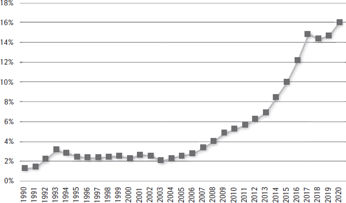 Экспорт стал только началом конца для фирм, не присутствующих в Китае и не имеющих желания конкурировать с китайскими компаниями. Вторым крупным неудобством для желающих «остаться дома» стали прямые иностранные инвестиции (ПИИ) китайских фирм. За последние 20 лет бум в Китае не только спровоцировал формирование поразительного кластера местных компаний с внушительных размеров активами, способствующими экспортной деятельности: многие компании решили, что они достаточно крупны и сильны, чтобы инвестировать, расширяться и строить форпосты за рубежом. Несомненно, перспективы еще больших прибылей от международных операций стали драйвером ПИИ китайских фирм. Экспорт имеет наибольший смысл (и прибыль), если можно его стандартизировать и унифицировать вне зависимости от того, в какой точке земного шара товары продаются. Однако не все и не везде хотят одного и того же. Чем больше экспорт нуждается в кастомизации для проникновения на зарубежный рынок, тем больше смысла получает производство локализованных версий не в самом Китае, а на соответствующем рынке (или поблизости). Зачастую именно это мотивирует фирмы, в том числе китайские, переходить от экспорта к ПИИ[5]. На рис. 1.7 показаны впечатляющий рост китайских инвестиций и накапливание зарубежных активов (в показателях ПИИ). Как следствие этих зарубежных инвестиций, даже бизнесмены, полагавшие, что они избавлены от конкурентных баталий с китайскими компаниями, обнаружили, что спасения нет. Хотя прирост иностранных активов Китая очевиден, а в процентах от ВВП (теперь 15 %) весьма впечатляющ, именно в процентах от ВВП этот показатель существенно отстает от такового в Швейцарии (230 %), Германии (59 %), Франции (66 %), Японии (42 %) и США (39 %). Таким образом, весьма вероятно, что в скором времени мы увидим еще большие потоки китайских ПИИ.