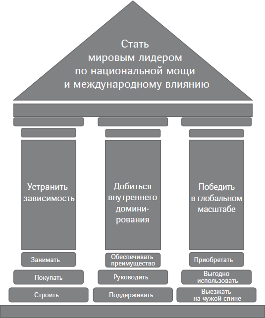 Стратегия. Но иметь амбициозную концепцию это одно, а вот реализовать совсем другое. Чтобы добиться цели, нужно иметь план стратегию, как сражаться и побеждать по пути. Корпорация Китай именно это и делает. По сути, Си сформулировал стратегию из трех частей или то, что мы называем «стратегические направления», опоры, так сказать, столпы. Первое направление ослабить и эффективно устранить избыточную зависимость Китая от иностранных фирм в области ключевых технологий и продуктов. Второе направление это обеспечить доминирование местных фирм на внутреннем рынке Китая. Третье направление победить в глобальном масштабе. Если коротко, то Корпорация Китай стремится стать мировым лидером по части национальной мощи и международного влияния, ослабив внешнюю зависимость, заняв преобладающие позиции внутри страны и одержав победу в глобальном масштабе. И для каждого стратегического направления имеются три ключевые тактики, предназначенные для достижения стратегических целей. Руководителю корпоративных коммуникаций любой западной многонациональной корпорации не потребуется и нескольких минут, чтобы взять эти элементы и создать на их основе симпатичную графику, которую можно затем поместить в презентацию PowerPoint и выдать для внутреннего и внешнего употребления. Выглядеть это будет примерно так, как на рис. 1.8.