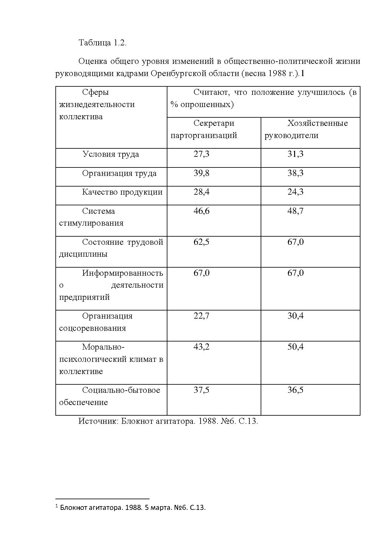 Из таблицы 1.1. видим, что среди руководящих и партийных кадров были достаточно сильны оптимистические настроения в оценке общего уровня изменений, достигнутого в коллективах после XXVII съезда КПСС. Причём, по показателям «условия труда», «состояние трудовой дисциплины» и «морально-психологический климат» больше положительных изменений отметили руководители хозяйств, непосредственно видевшие ситуацию в данном хозяйстве каждый день. Обозначим рост энтузиазма.