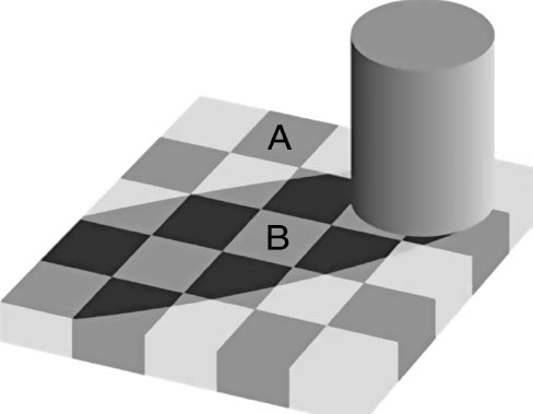 При взгляде на вторую картинку кажется, что клетки А и В разного оттенка. На самом деле оттенок серого у этих клеток совершенно одинаков. Но иллюзия сильнейшая, потому что мозг достраивает реальность по своим представлениям о ней, используя и комбинируя прежние знания о том, что: