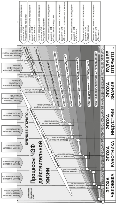 Эта главная последовательность исторически новых критических форм и прорывов (но не «градаций»! ) на схеме рисунка 1 представлена последовательностью пар больших белых кружков, соединённых круто восходящими отрезками узкой белой линии. Каждая пара напоминает стоящую почти вертикально гантель, а само пространство соответствующей «прорывной теории» ограничено прямоугольником, вытянутым строго вертикально. В свою очередь все эти «прорывные теории» главной последовательности схематично объединяет сильно вытянутый овал с надписью «Полилогия. Эндогенная логика. Теории прорывов.». Вот вся эта совокупность «теорий прорывов», её исследование, и составляет основное содержание метатеории «Полилогия» в части лишь эндогенной логики восходящего исторического развития отдельно взятого общества на критическом этапе перехода общества от одной формы производства к другой, от одной градации к другой, более исторически высшей по сложности. В целом же основное фоновое поле схемы представляет графическое отображение исторического развития всех чистых эндогенных форм (способов производства) в виде «слоёв», вертикальный размер которых соответствует достигнутой к данному историческому моменту (горизонтальная ось «время) величины сложности (ось «сложность процессов ЧЭФ»). Соответственно белой толстой ломаной кривой с большими белыми кружками отображена интегральная кривая исторического восходящего роста данного общества как сумма сложности всех ЧЭФ-слоёв на каждый момент времени (см. рис 5. [36, с. 29]).