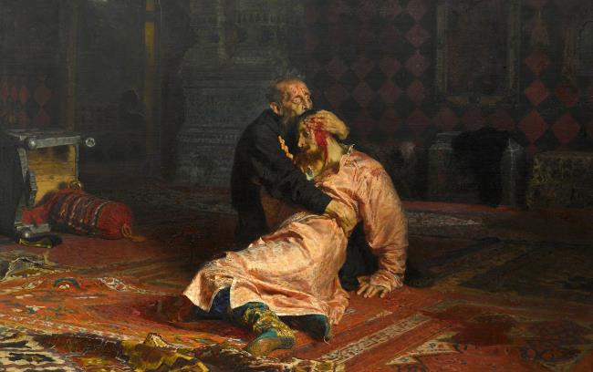 На репинском полотне Иван Грозный прижимает к себе полулежащего на полу сына и тщетно пытается остановить кровь. Лицо царя бледно, вылезающие из орбит глаза безумны, а умирающий с доброй улыбкой царевич словно прощает отцу его страшный грех.