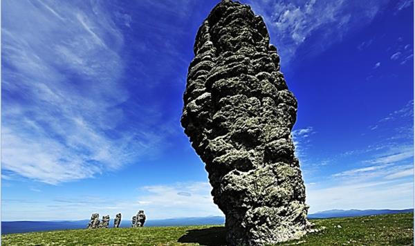 Маньпупунёр уральский остров Пасхи. Это одно из несомненных чудес природы Северного Урала (см. рис. 1.10). На языке манси название означает Малая гора идолов. Эти семь тридцатиметровых каменных фигур выветривания возносятся над плоским горным плато. Некоторые из них расширяются кверху. Находится геологический феномен на территории Печоро-Илычского заповедника. В древности манси и коми обожествляли грандиозные каменные изваяния, поклонялись им. При этом подниматься на Маньпупунёр не позволялось. О столбах слагались легенды. По одной из них каменные столбы были семью великанами-самоедами, которые шли через горы в Сибирь уничтожить вогульский народ, но окаменели от страха, увидев Ялпингнёр священную гору вогулов.