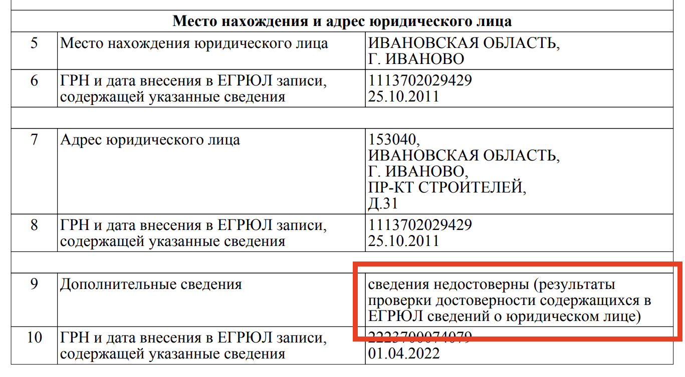 Рис. 9. Фрагмент выписки из ЕГРЮЛ, в которой сделана запись о недостоверности адреса юридического лица