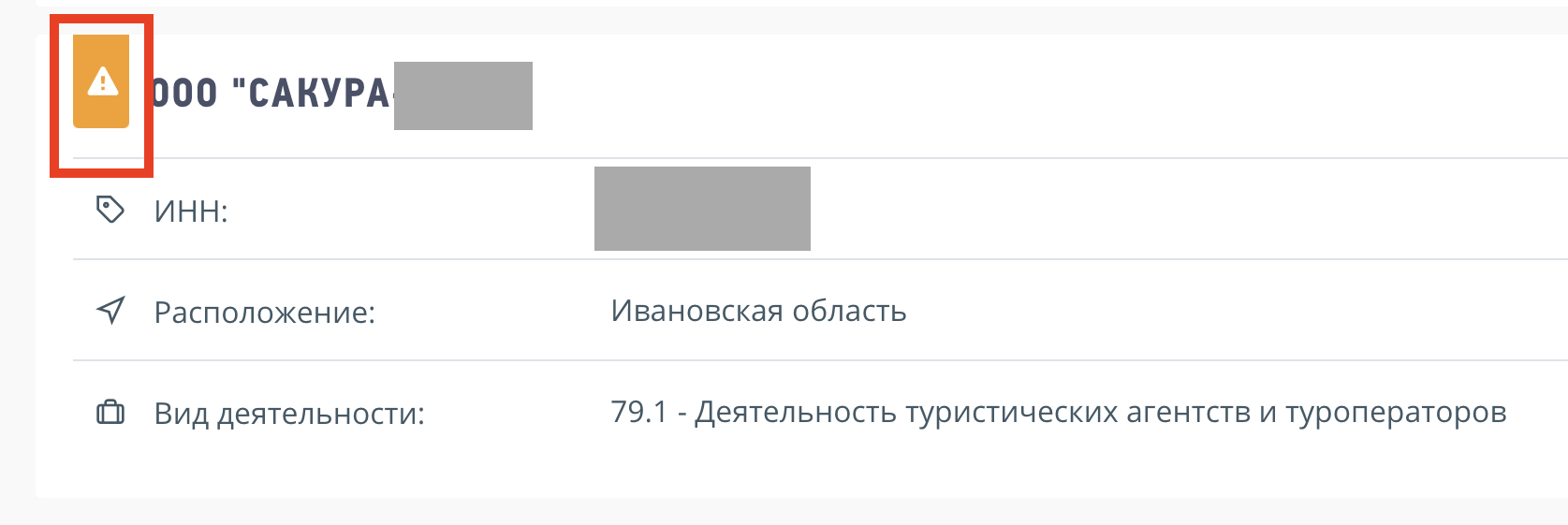 Кликнув на адрес, вы перейдете в результаты поиска тут нужно найти интересующую компанию. Размещенный рядом с наименованием организации восклицательный знак на оранжевом фоне (рис. 8) будет говорить о том, что сведения об адресе признаны недостоверными, а значит организацию может ждать исключение из ЕГРЮЛ.