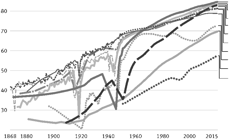 Ожидаемая продолжительность жизни при рождении, 18682015 гг. (среднее число лет, которое должен был бы прожить новорожденный, если бы структура смертности, зафиксированная на год его рождения, оставалась неизменной на протяжении всей его жизни)
