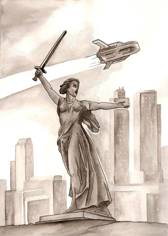 С прибытием, друзья! Мы готовимся совершить посадку в Волгограде! Пожалуйста, не отстегивайте ремни до полной остановки шаттла. На экранах вы видите одно из немногих сохранившихся чудес Земли статую «Родина-Мать». Подробнее о ней вы можете прочитать в сегодняшней информационной рамке.