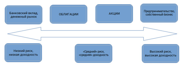 На левой стороне спектра находится банковский вклад, например, на срок 1 год. На правой стороне спектра собственный бизнес, который вы, возможно, уже ведёте.