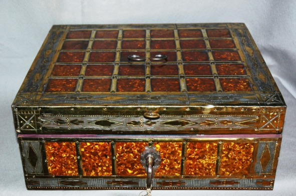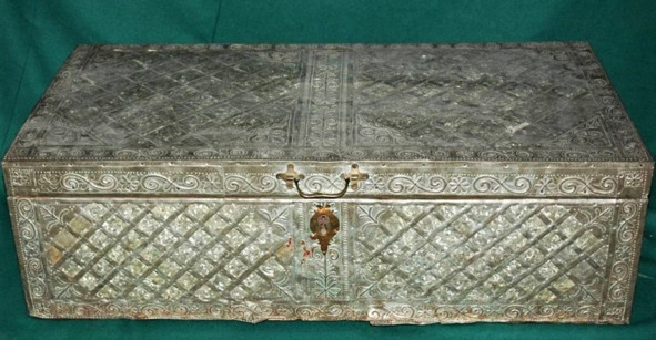 Ил. 6. Сундук. Мастерская А. С. Алексеева. До 1902 года, Невьянск. Дерево, жесть, латунь, «мороз» по жести, чеканка, литье (один из экспонатов выставки, ныне в ОНИ ГРМ).