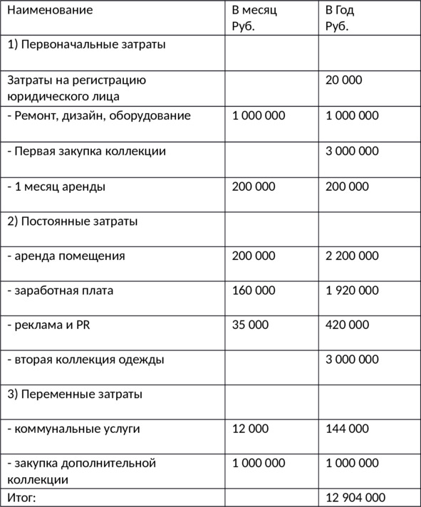 В переменные затраты может входить закупка дополнительной коллекции одежды или ее частей (необходимо отслеживать скорость продаж и постоянное наполнение торгового зала).