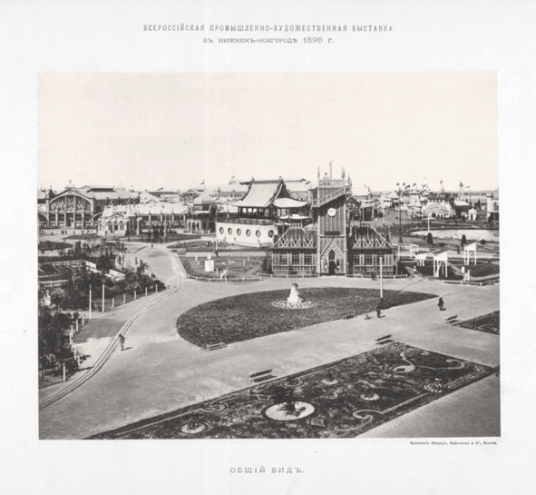 XVI Всероссийская промышленная и художественная выставка проходила в Нижнем Новгороде с 28 мая (9 июня) по 1 (13) октября 1896 года (ил. 1). Ее целями было оценить успехи, достигнутые русской промышленностью, сблизить потребителя и производителя, расширить рынки сбыта. При этом она должна была «явиться правильно и возможно полно организованным дополнением ярмарки»24. Ю. А. Никитин писал: «Нижегородская выставка стала важным событием общественно-экономической и культурной жизни страны. Она оказала благотворное влияние на развитие промышленности, сельского хозяйства, торговли, способствовала техническому и социальному прогрессу»25. Общее количество экспонентов составило 8562 человека. Для строительства выставочного городка казной было выделено 3094340 рублей. Вся сумма казенных издержек, связанных с выставкой, доходила до 8,8 млн. рублей26. В городе тщательно подготовились к этом «промышленному смотру»: построили здания драмтеатра, суда, биржи Волго-Камского банка, гостиниц, пустили первый в России электрический трамвай, устроили фуникулеры. Н. Ф. Филатов отмечал: «Подобное градостроительное переустройство во многовековой истории Нижнего Новгорода сопоставимо лишь с 1780-ми годами, когда он изменил средневековую структуру, был впервые перепланирован на регулярной основе и практически заново отстроен»27. Одновременно с выставкой был проведен Всероссийский промышленный съезд, в котором приняло участие 800 представителей торговли и промышленности.