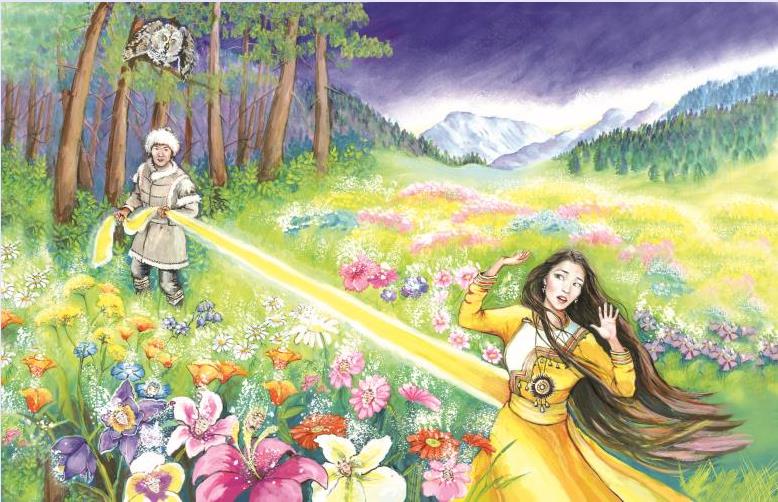 В полночь Улугэн вышел на поляну. Со всех сторон раздался звон бубенчиков и колокольчиков, послышалась песня. Пела эту песню девушка. Как только раздалась песня, вся долина осветилась. Каждый цветок излучал свет. А среди этих цветов виднелась на траве жёлтая полоска.