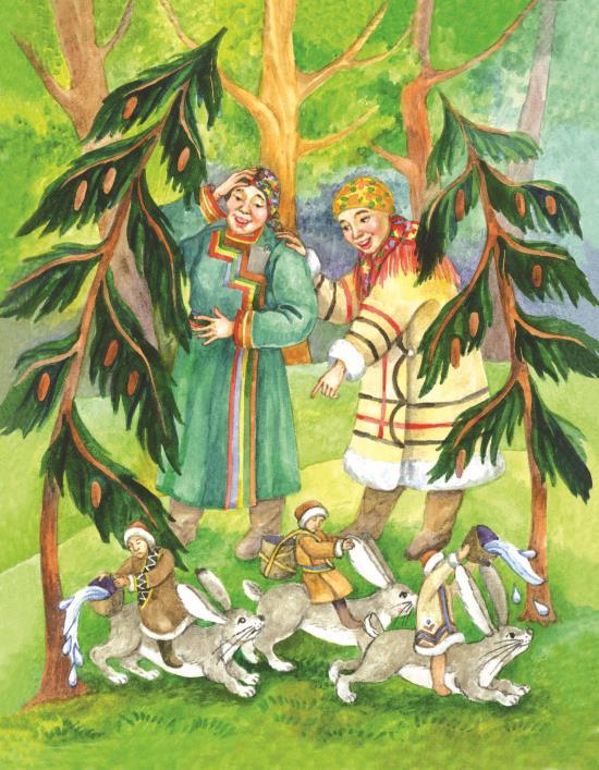 Стали ждать гостей. Наши пошли рубить дрова для костров. Видят: едут маленькие вечные люди на осёдланных зайцах. Нашим женщинам стало смешно, и они захохотали.