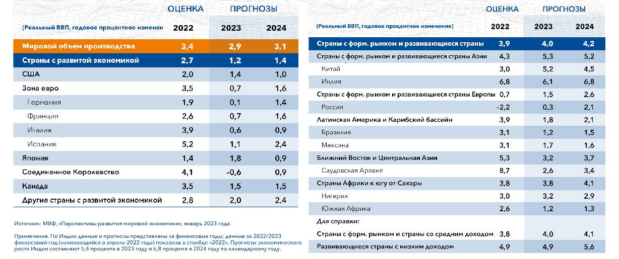 Потенциальный ВВП это возможный внутренний валовой продукт в условиях полной занятости населения при использовании всего имеющегося ресурсного потенциала страны. Его рассчитывают для определения показателей, которых может достичь страна при рациональном использовании ресурсов, грамотном планировании и обеспечении занятостью всех трудоспособных граждан на фоне естественного уровня безработицы. На его основе и с учетом других экономических и геополитических факторов строят прогнозы роста экономики. С докладом о перспективах развития мировой экономики 2 раза в год выходят МВФ и Всемирный банк. Далее представлены прогнозы от ведущих мировых организаций на 20232024 годы.
