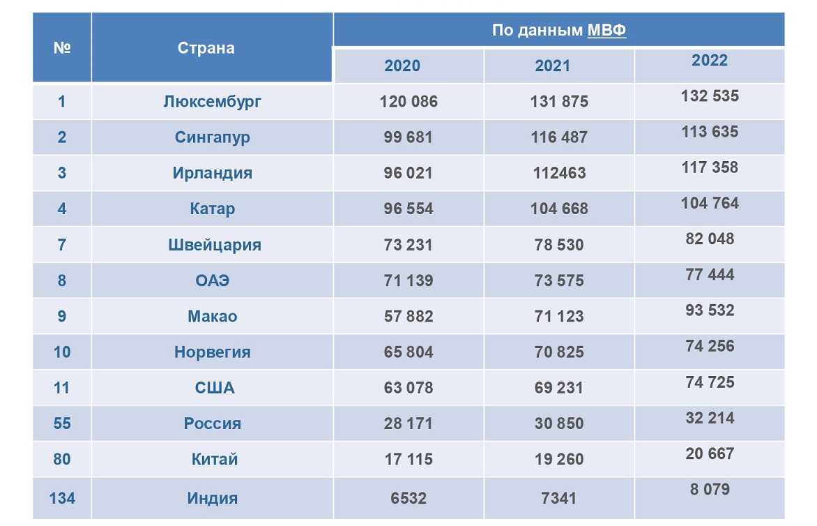 Поэтому Китай по ВВП на душу населения занимает в рейтинге лишь 59е место, Индия 143е, Россия 63е, а США 6ое. Лидер по данному показателю Люксембург, где на одного гражданина приходится почти 138 тыс. $. В переводе на рубли это примерно 10 млн 350 тыс. руб. в год (для сравнения, ВВП на душу населения на одного россиянина составляет 875 тыс. руб. в год). За Люксембургом следуют Сингапур, Ирландия, Швейцария, Норвегия и другие страны, которые не попали даже в первую двадцатку по показателям номинального ВВП и ВВП по ППС. При этом нужно понимать, что ВВП на душу населения это усреднённое значение. Оно не отражает неравенство в доходах людей внутри страны.