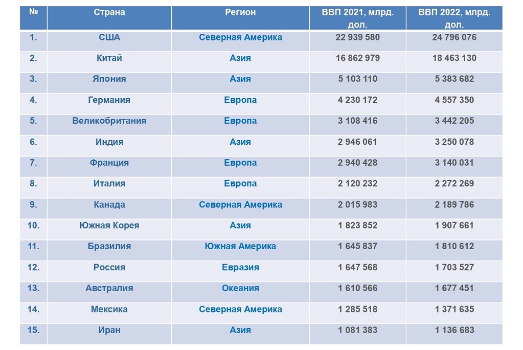 В таб. 2 показан номинальный ВВП стран за 20212022 годы. В списке лидируют США, за ними следует Китай, Россия находится на 12м месте.