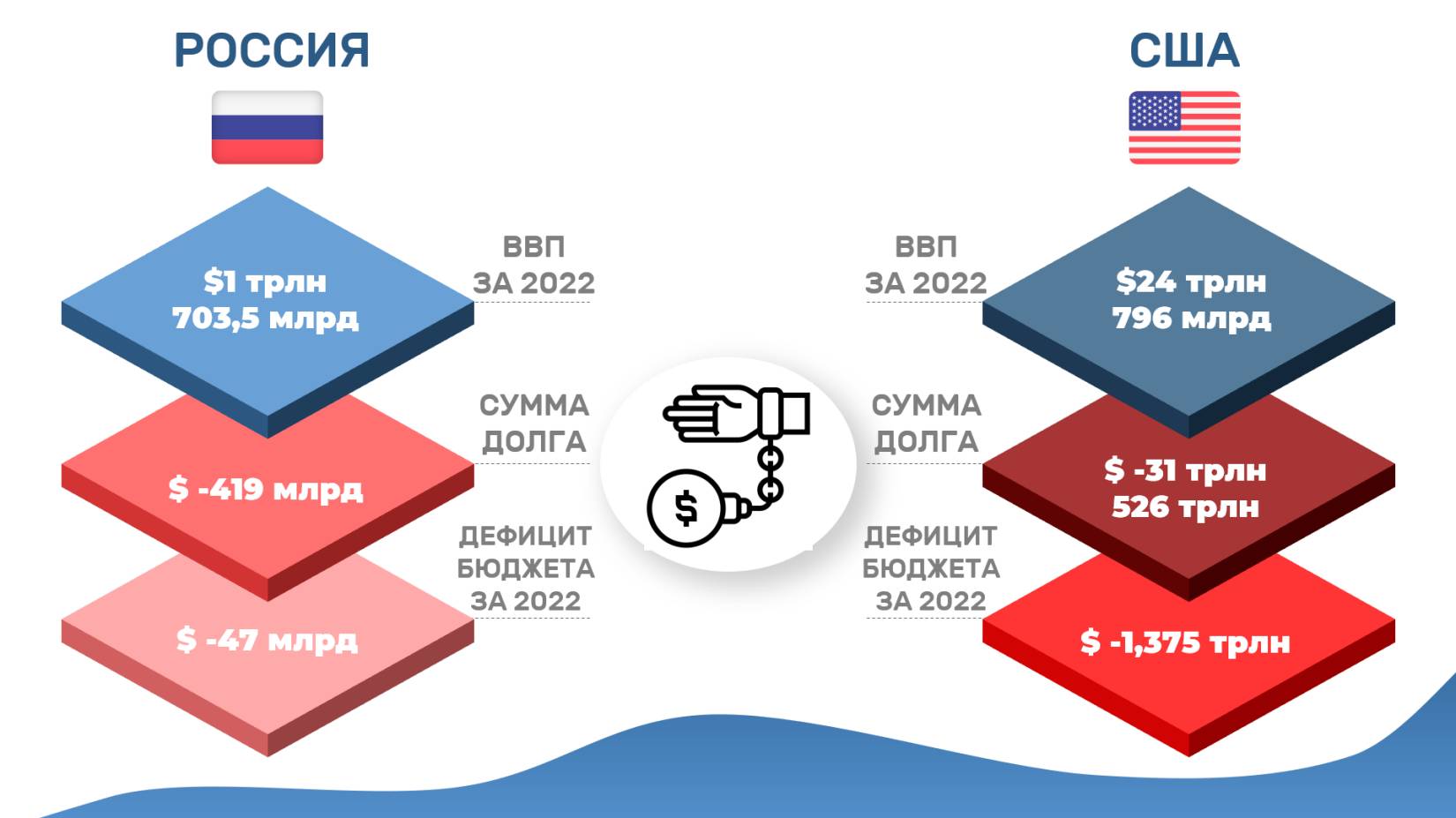 Рис. 2.7. Сравнение общего долга к ВВП США и России за 2022г.