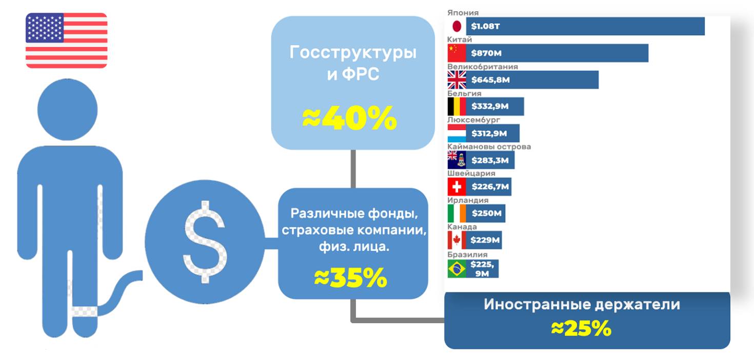Вопервых, основные держатели американских ценных бумаг госструктуры самих США, то есть, по сути, это внутренний долг. Так происходит потому, что у многих государственных ведомств этой страны остаются неиспользованные средства, которые инвестируются в гособлигации. Это примерно 40 % госдолга США. Остальные долги приходятся на различные паевые фонды, пенсионные фонды, страховые компании и облигации физических лиц. Доля иностранных держателей составляет всего около 25 % от его объемов (данные по итогам 2022 года).