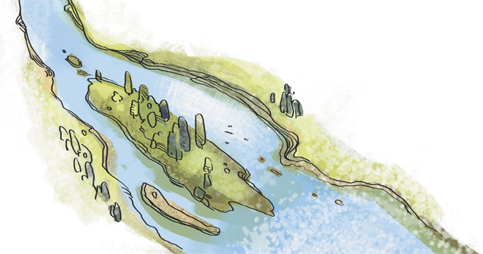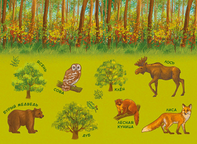 Такое лысое место называется «болото», оно влажное и топкое. А зверь с рогами это лось. Удивительное дело: такой огромный, а в болотную трясину не проваливается. Секрет в том, что у него очень широкие копыта, размером с тарелку. Кроме лосей, в лесной зоне живут белки, совы, лесная куница, бурый медведь, лисы, много птиц.