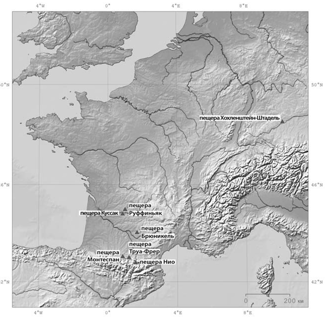 Невозможно представить себе мир таким, каким он был 40 тысяч лет до н. э., но важно попытаться это сделать. Людей было немного. Они могли чувствовать свое глубокое восприятие мира и, возможно, полагали, что мир столь же разумен и чувствителен к их действиям. Прежде всего, нужно помнить 30 тысяч лет до н. э. современные люди жили вместе с неандертальцами. Эти две группы людей были настолько близки биологически, что скрещивались по всей Европе. Многие из ныне живущих и сейчас имеют различные неандертальские гены. Оба этих вида много перемещались, следовали за стадами северных оленей и охотились на более крупных животных, вплоть до огромных мамонтов. Растительная пища также имела для них большое значение, но в реальности была доступна в любых количествах только в летние месяцы. И неандертальцы, и современные нам люди строили сооружения, укрывались в пещерах. Овал сломанных сталактитов и сталагмитов найден в пещере Брюникель во Франции, рядом с кругом сталактитов (см. рис. 2.1 с картой объектов, упомянутых в этом разделе)[15]. Они датируются примерно 47 тысячами лет назад, поэтому очень вероятно, что их построили неандертальцы. Этот факт усиливает схожие возможности двух видов современных людей и неандертальцев. Неандертальцы также создавали произведения искусства этот факт вызывает некоторый ажиотаж. Около 40 тысяч лет до н. э. современные люди прибыли в Европу и постепенно вытеснили оттуда неандертальцев, несмотря на редкие случаи положительного взаимодействия.