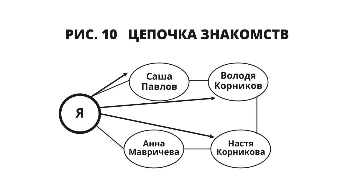 Саша также познакомил меня со своим другом Володей Корниковым. На совместных тусовках я подружился с Володиной женой Настей. Ни одного вечера не проходило без споров с ней на разные темы о политике, религии, жизни общества, экономике. Праздник общения превращался в интеллектуальную драку. Настя была главным редактором журнала «Темы и лица». Естественно, она поместила мою статью в этом журнале. Там же публиковалась Анна. Настя познакомила нас в 2008 или 2009 году. Я работал с ее образом, провел с ней фотосессию и прошел у нее несколько тренингов по ораторскому мастерству. Потом я работал в крупной компании по продаже профессиональной косметики в Москве и позвал Анну обучать команду продажников. Так мы дружим с ней все эти годы. Посмотрите, как выглядит на схеме наше знакомство (см. рисунок 10).