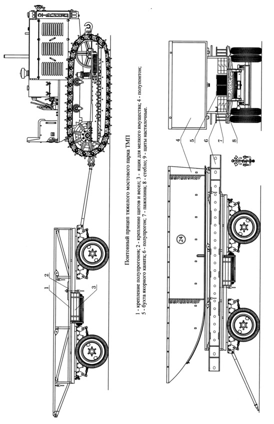 Также парк перевозился на трехтонных прицепах с использованием тракторов. Прицепы оборудовались как в заводских условиях, так и силами войск. Прицепы изготовленные на заводах имели металлическую раму и крепления для понтонного имущества парка. Для перевозки на прицепах оборудованных в заводских условиях требовалось 36 тракторов и 98 прицепов, при перевозке на прицепах оборудованных в войсках количество тракторов увеличивалось до сорока тракторов и до 108 прицепов. Из прицепов формировалось 36поездов по 3 прицепа, из них 24 понтонных поездов, 6 поездов для перевозки прогонного и паромного имущества с разведывательными катерами НКЛ-27, 2 поезда с береговым имуществом и буксирно-моторными катерами и 4 поезда по два прицепа с дополнительным имуществом, цистернами и катерами.