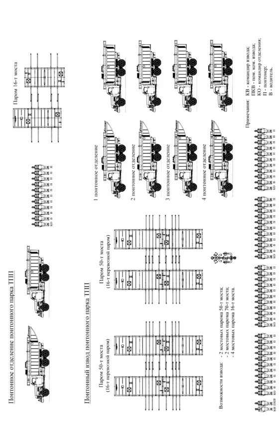 Парк предназначен для устройства мостовых и паромных переправ грузоподъемностью 16, 50 и 70 тонн.