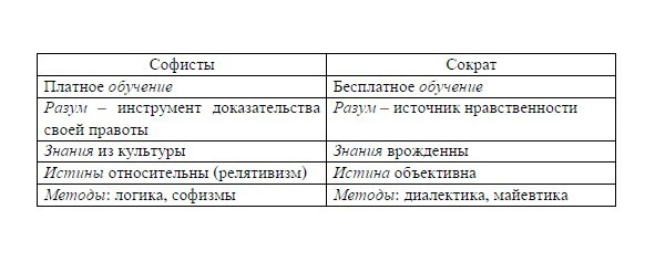 Итак, Сократ преодолел этический релятивизм софистов, создал диалектический метод познания. Хоть и, по словам Б. Рассела, Сократ как предмет изучения представляет для историков философии значительные трудности, именно Сократ (Сократ Платона) является основателем европейской классической философской традиции. О достоверности исторических сведений о Сократе сомневаться не приходится, поскольку помимо диалогов Платона есть еще комедия Аристофана «Облака» и свидетельства Ксенофонта, ученика Сократа, который, как пишет Б. Рассел, считался не слишком умным, чтобы что-то исказить в учении Сократа19. Сократическая методика, представленная в диалогах Платона и часто используемая в философской практике сегодня, людьми с либеральной чувствительностью справедливо мыслится в качестве тоталитарной и даже травмирующей практики, основывающейся на интеллектуальном элитаризме. Об этом можно прочитать и в учебной литературе20, и в отзывах апологетов сократической методики, практикующих ее21. В таблице ниже приведено сопоставление учений софистов и Сократа.