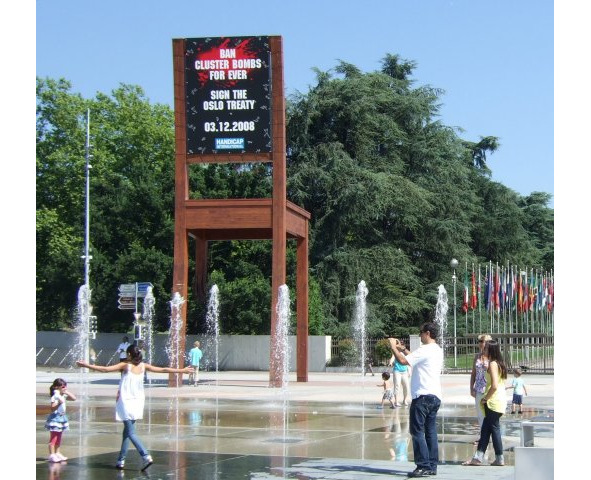 Конвенция была оформлена 30 мая 2008 года в Дублине, а её подписание началось 3 декабря 2008 в Осло, о чём и говорит текст на спинке стула перед входом в Европейский офисный комплекс ООН в Женеве. Вступила в действие данная Конвенция 1 августа 2010 года (через 6 месяцев после того, как она была изначально ратифицирована уже 30 странами).