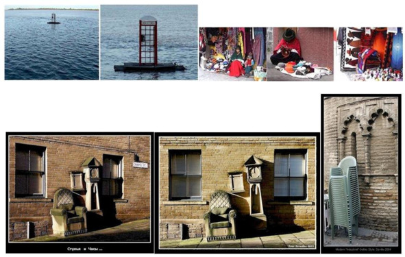 А это уже начало массовой «цифровизации» фотографии. Слева вверху сценка в Гуаякиле (Эквадор), где телефонная будка установлена даааалекооооватоооо от берега, а рядом = эквадорские индейцы и их народные промыслы (кадры с цифровой видеокамеры), а ниже образцы «уличной» оригинальности (стулья и часы в Брадфорде в районе, который все знают как «Маленькая Германия»), а пластиковая стульевая готика = уже в Севилье