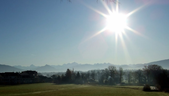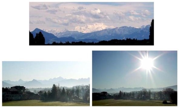 Это чуть менее компрессированный вариант мимолётного «взгляда на Монблан» от имения (шатó) философа Вольтера в Ферне В середине зелёного «газона» видна протоптанная тропинка. По преданию, именно в этом самом месте ступала нога диссидентствующего философа-бунтаря, когда ему приходилось срочно скрываться от сил французского правопорядка «за кордоном», то есть в соседней швейцарской Женеве. Бежать сначала надо было через лужок (на снимке), а потом через лесок (До сих пор этот лесочек сохранился, правда давно уже в плачевном состоянии Ходят слухи, что его реальный собственник-хозяин получал от жаждущих застройщиков множество привлекательных и соблазнительных предложений продать землю под возведение очередных человейников и торговых центров под боком у Женевы и в непосредственной близости к аэропорту. Но устоял перед соблазном и заявил, что их деньги его не интересуют, но и своих свободных денег на поддержание в приличном виде остатков лесочка у него нет, увы Так вот и умирает постепенно захиревший лесочек на глазах многочисленных спортсменов и собачников.