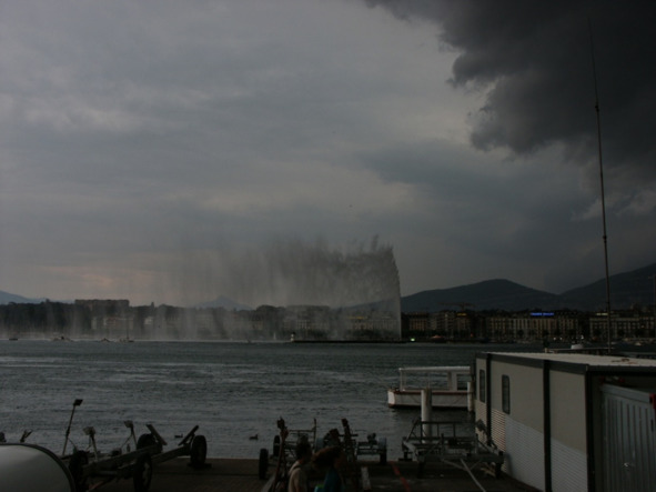 Шквалистый ветер сносит фонтан «Джет» на озере Леман в Женеве (август 2003 года) И «буря мглою небо кроет»