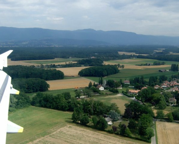 на горы Салев,на Монблан,на Женевус озером на ЛеманАккуратная Швейцария на подлёте к Женеве, а на заднем плане Юрские горы А зимой там катаются на горных лыжах и на беговых тоже
