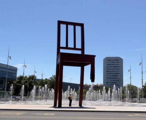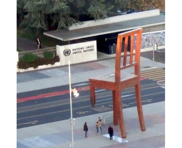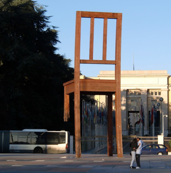 А в Женеве довелось сфотографировать перед самым входом в комплекс ООН вот такой «колченогий» стул в разное время: