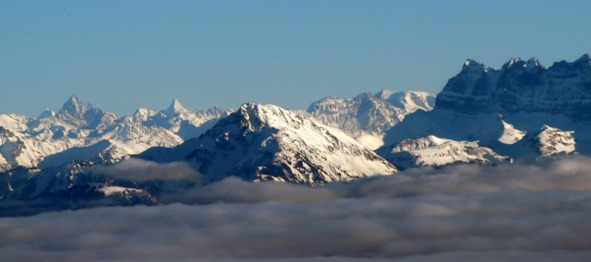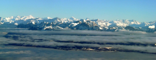 Женева внизу, она под прерывистым слоем облаков и тумана, а выше облаков = только Альпы с Монбланом, да чистое небо