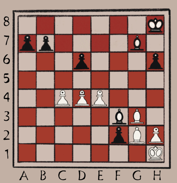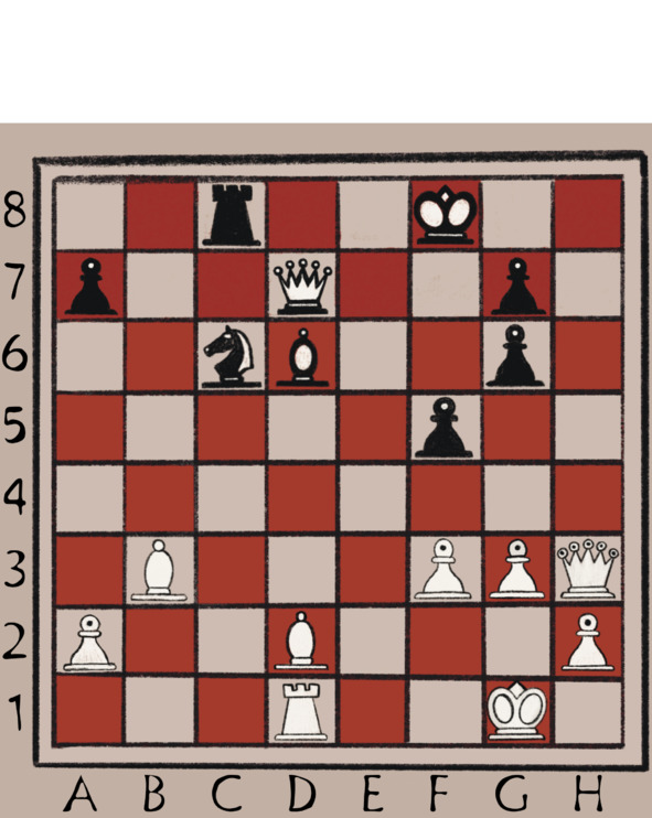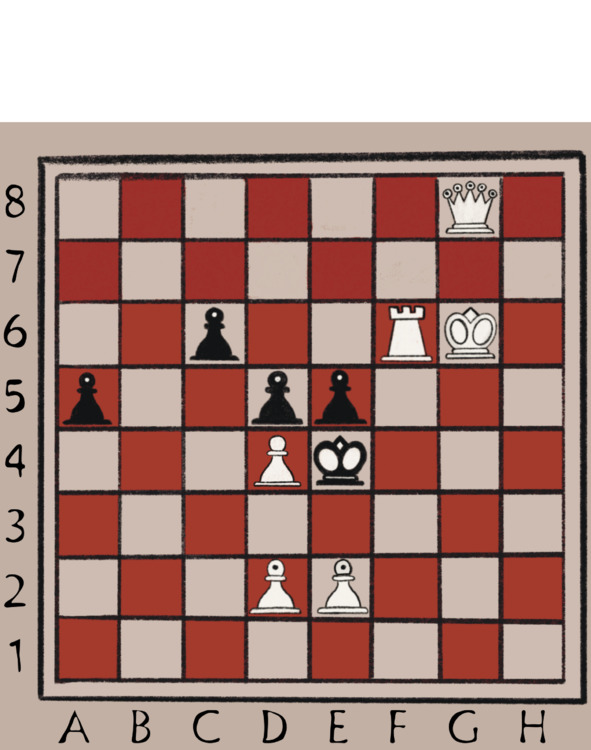 The room was substantially a circle, in whose center there was a chessboard with pieces on it in a position enabling a checkmate in one move (Blacks move)1: