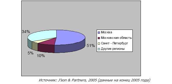 В остальных регионах, на долю которых приходится около трети всех подключений, наблюдается основной рост. Если в целом по всем подключениям («офисным» и «домашним») в Москве с областью и Петербурге их количество за год выросло на 75%, то в регионах рынок вырос более чем в 2,5 раза, в том числе количество «домашних» подключений в 3,2 раза. Особенно быстро растет бизнес ADSL-провайдеров в течение 2005 г. количество домашних ADSL-подключений по оценке Json & Partners выросло более чем в 3 раза, в регионах более чем в 5 раз.