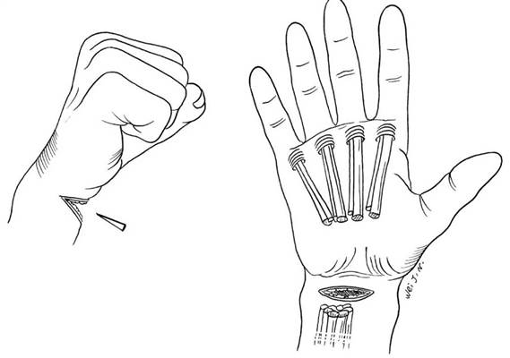 Рис. 15. Резаная рана запястья в состоянии кисти, согнутой в кулак. После разрыва СПС и СГС дистальные концы сухожилий могут быть втянуты в ладонь в момент выпрямления пальцев кисти