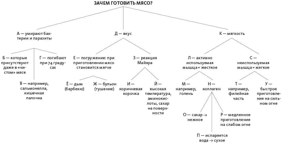 Предстоит связать между собой идеи, обозначенные A, Д и К («убивает бактерии», «вкус» и «мягкость»). Все они относятся к подкатегории «три причины, по которым люди подвергают мясо тепловой обработке». Но если преподаватель просто прочитает лекцию, не подчеркнув этого, некоторые слушатели упустят эту важную связь. Связи между соседними предложениями в лекции наверняка будут установлены довольно легко, ни одно из них не удивит студентов и не заставит задаться вопросом: «Погодите, а это к чему?»