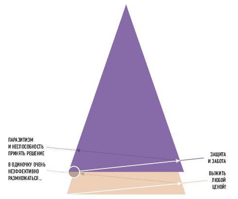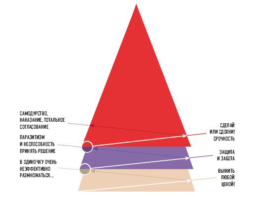 Когда у племени все хорошо и количество соплеменников увеличивается, вождю становится все сложнее выполнять свои обязанности: раздавать всем задачи и следить за тем, чтобы они выполнялись. Начинает все сильнее проявляться темная сторона: возникают интриги, слухи, неприязнь к коллегам, которые незаметны, потому что люди не обладают достаточной энергией, чтобы открыто сесть и обсудить свои ожидания друг от друга. Расцветает паразитизм, все сильнее проявляется неспособность принимать решения. Племя рискует превратиться в толпу, которая управляется неконтролируемыми призывами провокаторов. Чтобы обуздать эту энергию, нужен лидер, который будет применять насилие ради общей пользы выживания племени.