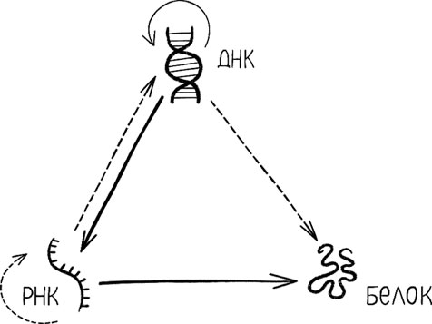 Поэтому мы сосредоточимся на ключевом понятии центральной догме молекулярной биологии. Название пафосное, но это потому, что описывает оно ключевой принцип молекулярной биологии и вообще жизни. А сформулировал этот принцип Фрэнсис Крик один из легендарных авторов открытия структуры[18] молекулы ДНК. Если выразить ее коротко, то в изначальном виде она звучит так: информацию, записанную в виде ДНК, можно перевести в форму РНК, а из РНК в белок[19].